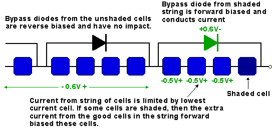 跨過太陽電池組的旁路二極管。無遮擋太陽電池上的電壓依賴于被遮擋太陽電池被遮擋的程度。上圖中只是簡單地表示為0.5V。